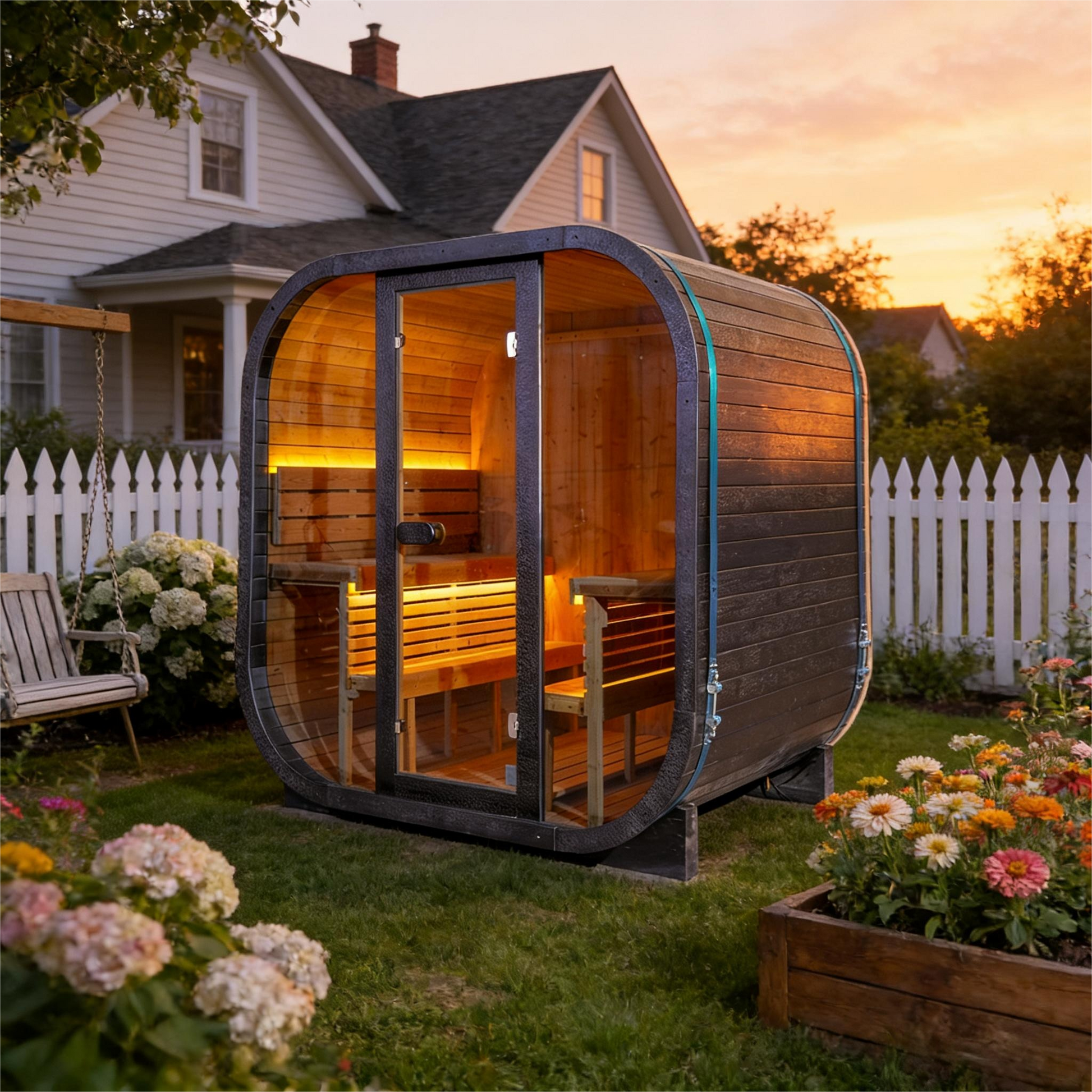 Transform your backyard into a luxury wellness oasis with this striking black outdoor traditional steam sauna—a perfect blend of modern design and timeless relaxation. Crafted for durability and style, this 4-person square cabin features a sleek textured black tempered glass front that balances privacy with a warm, inviting glow.